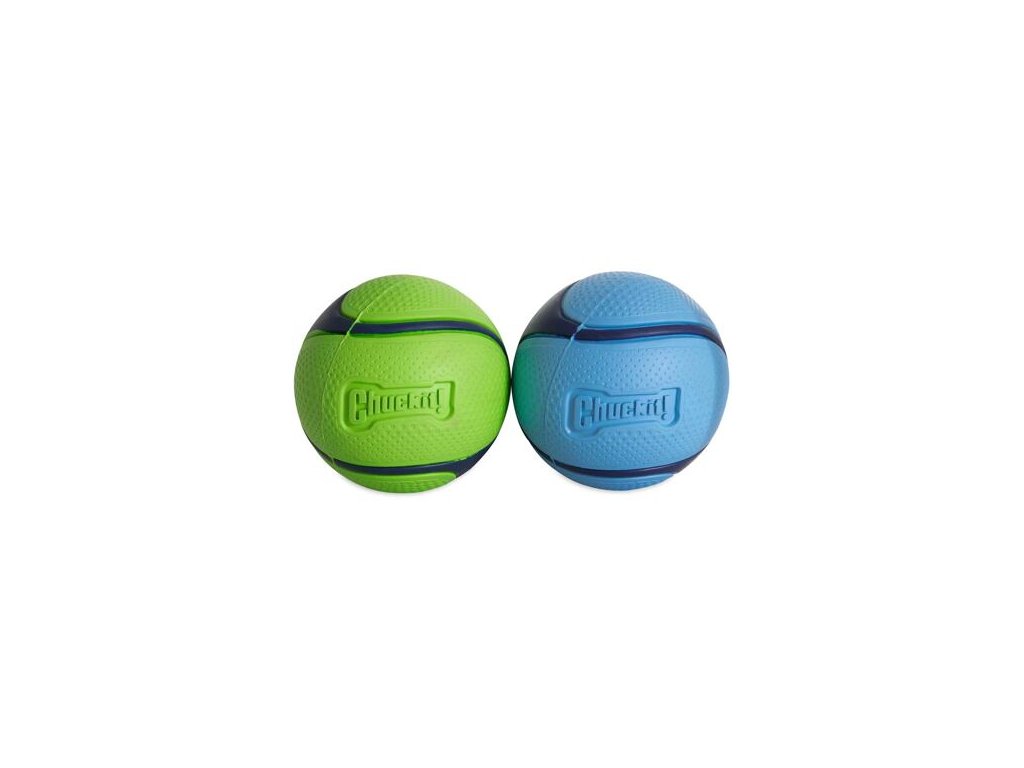 Sada aportovacích míčků – modrý míček s vůni slaniny a zelený míček s vůní arašídového másla.Míčky jsou vyrobeny z odolné přírodní gumy s extra silným jádrem, skvěle skáčou a padnou do házečů Chuckit! velikosti M.