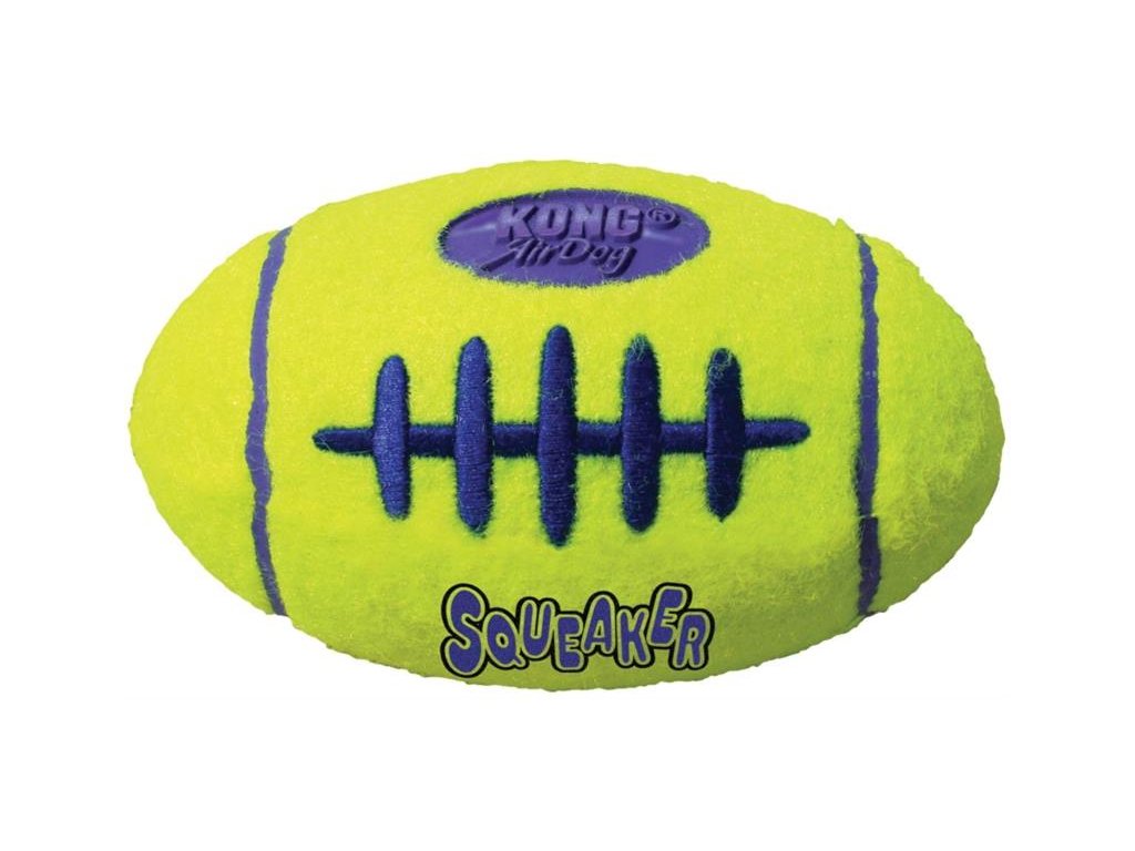 Hračky pro psy originál AIR KONG SQUEAKER od zakladatele anglické psí školy doktora Mugforda se vyrábějí v továrně na tenisové míčky. Kvalitní kaučuková směs spolu s navulkanizovaným plstnatým povrchem propůjčují těmto zajímavým hračkám pro psy zvýšenou životnost. Hračka Air dog Míč rugby Kong je jako odměňovací hračka, pomocník při výcviku poslušnosti psa a ideální pro aportovací trénink na souši i na vodě nebo pro volnou koupací zábavu psů. Uvnitř hraček je kvalitní pískátko, které motivuje psa ke hře. Povrch hračky je ozdoben výšivku SQUEAKER.