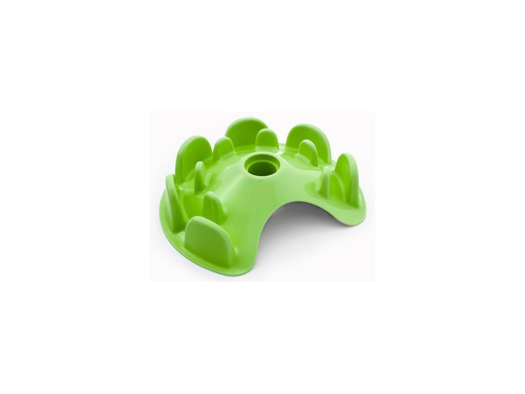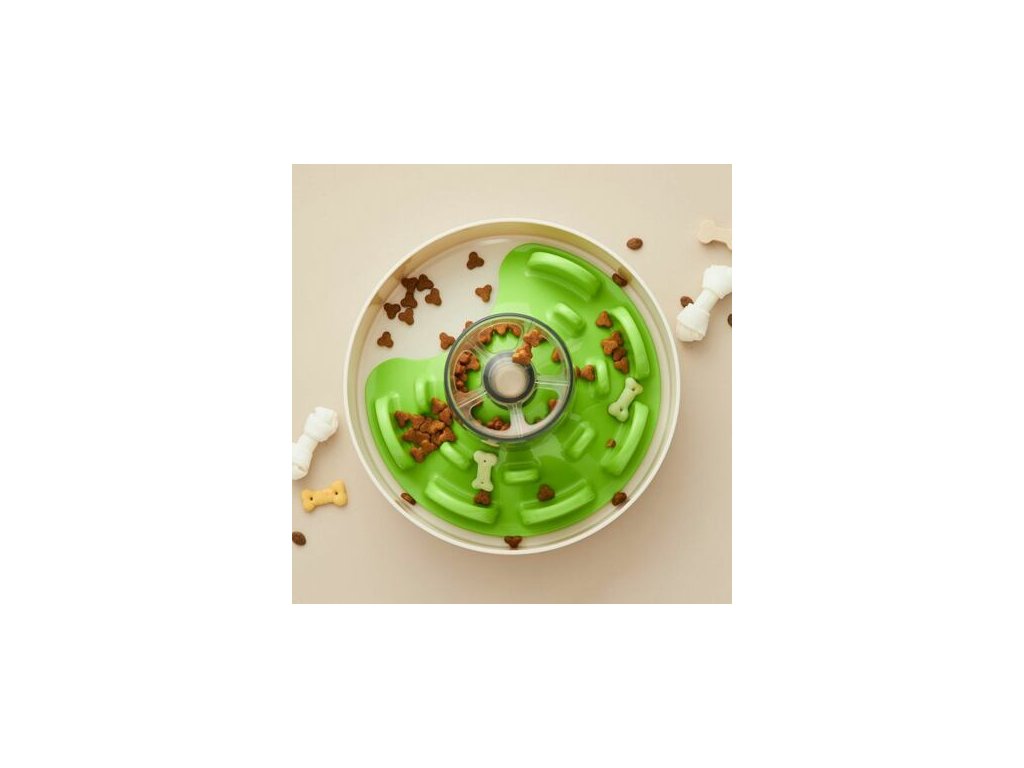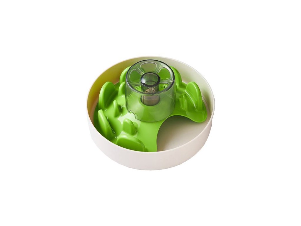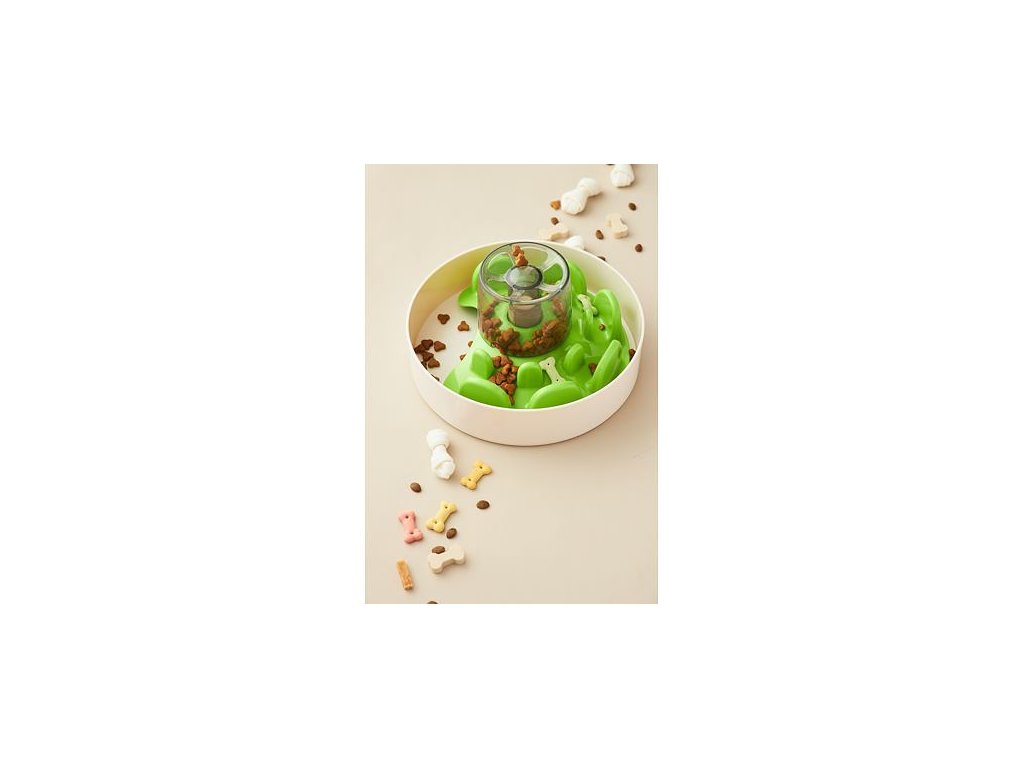 Krmivo lze podávat přímo na dno misky, mezi zelené hrbolky, nebo do šedé děravé nádoby. Když bude pejsek zeleným dílem otáčet, jídlo propadá na dno misky. Nejen že se tak při krmení bude bavit ale samotná hostina mu zabere delší dobu.