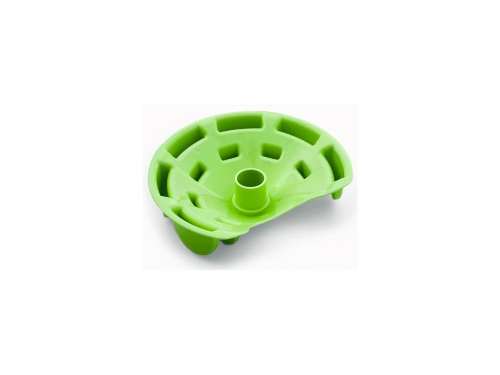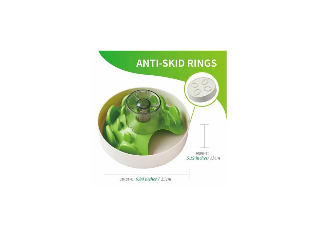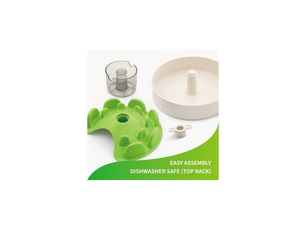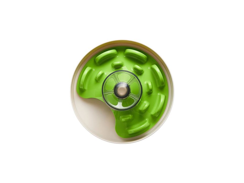 Krmivo lze podávat přímo na dno misky, mezi zelené hrbolky, nebo do šedé děravé nádoby. Když bude pejsek zeleným dílem otáčet, jídlo propadá na dno misky. Nejen že se tak při krmení bude bavit ale samotná hostina mu zabere delší dobu.