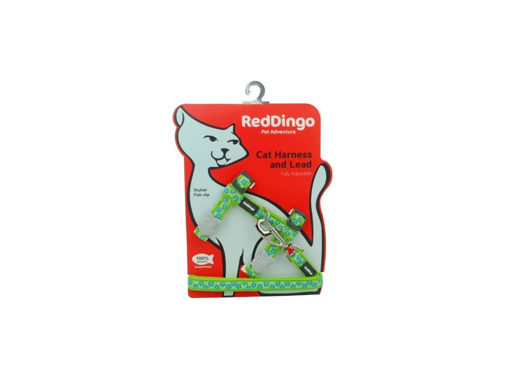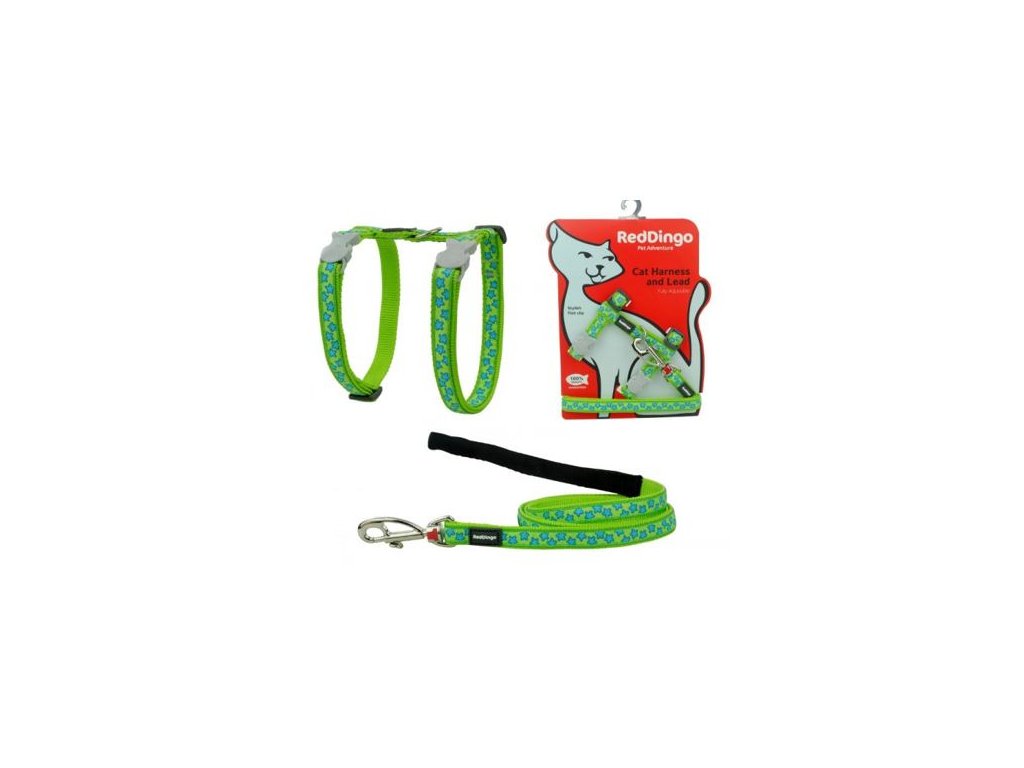 Red Dingo postroj s vodítkem pro kočky – Stars Turquoise on Lime – 12 mm
