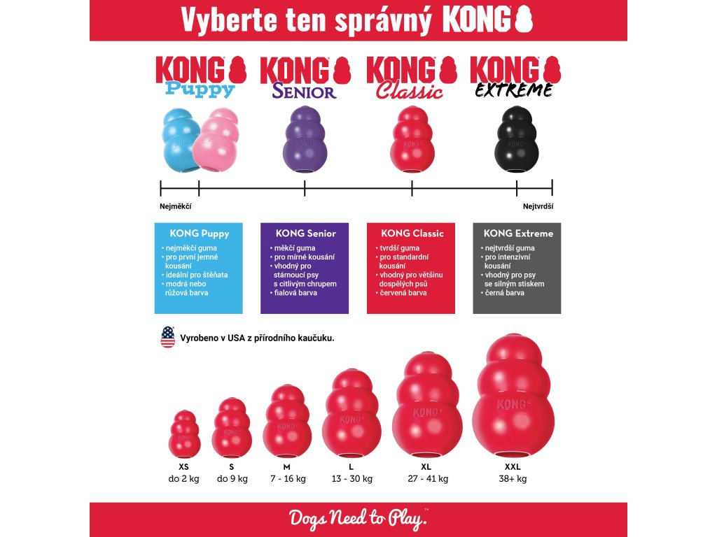 KONG Classic = už přes 30 let zlatý standard psích hraček. Hračka KONG Classic je interaktivní plnitelná hračka vyrobená z čistě přírodního kaučuku, který je mimořádně pružný a zároveň pevný, vhodný i pro největší ničitele hraček. Při aportování představuje pro psy vzrušující výzvu díky speciálnímu tvaru (připomínajícímu sněhuláka), který zajišťuje při dopadu nepředvídatelný odskok. Zájem psa o hračku můžete ještě zvýšit, když ji naplníte krmivem nebo pamlsky.