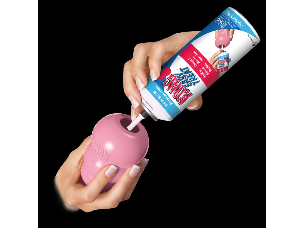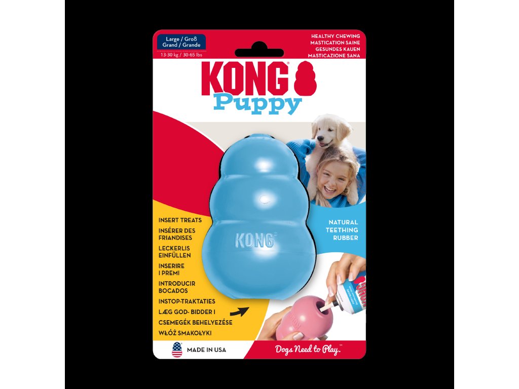 KONG Puppy je interaktivní plnitelná hračka pro štěňata ze speciální odolné gumy. Je výborná zejména pro štěňátka do věku 9 měsíců, její předností je daleko větší odolnost než u jiných běžně dostupných hraček. Je vyrobena z ultra elastického, čistě přírodního kaučuku, který je velmi pružný a zároveň velmi odolný a pevný i pro největší ničitele hraček. Speciální tvar zajišťuje při dopadu nepravidelný odraz. Hračku lze naplnit pamlsky nebo pastou a zvýšit tak zájem psa o hračku.