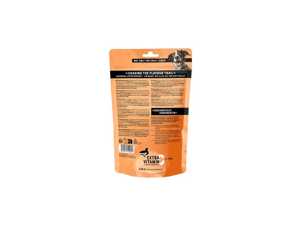 Plátky kachního masa s extra dávkou vitamínu C jsou přírodní pamlsky, vhodné pro psy každého věku a velikosti, od štěňat až po seniory.Obsahují 95 % kachního masa a díky monoproteinovému složení jsou vhodné i pro psy s potravinovými alergiemi. Nenajdete v nich obiloviny, přidaný cukr, umělá barviva, aromata ani konzervanty. Maso je šetrně sušené vzduchem, aby si zachovalo svou přirozenou chuť a živiny, a díky tomu je křehké a snadno se porcuje.