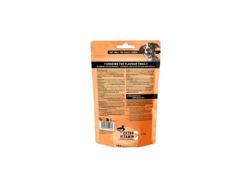 Plátky kachního masa s extra dávkou vitamínu C jsou přírodní pamlsky, vhodné pro psy každého věku a velikosti, od štěňat až po seniory.Obsahují 95 % kachního masa a díky monoproteinovému složení jsou vhodné i pro psy s potravinovými alergiemi. Nenajdete v nich obiloviny, přidaný cukr, umělá barviva, aromata ani konzervanty. Maso je šetrně sušené vzduchem, aby si zachovalo svou přirozenou chuť a živiny, a díky tomu je křehké a snadno se porcuje.