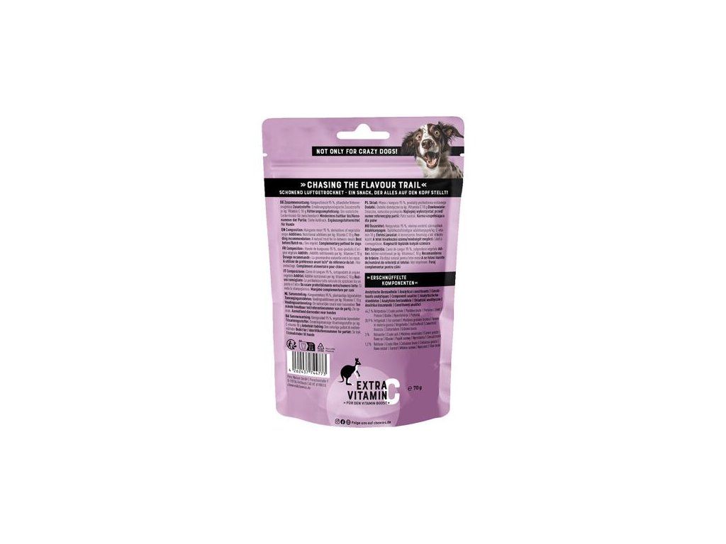 Plátky vzduchem sušeného masa s extra dávkou vitamínu C obsahují 95 % klokaního masa a díky monoproteinovému složení jsou vhodné i pro psy s potravinovými alergiemi. Nenajdete v nich obiloviny, přidaný cukr, umělá barviva, aromata ani konzervanty. Maso je šetrně sušené vzduchem, aby si zachovalo svou přirozenou chuť a živiny, a díky tomu je křehké, snadno se porcuje a pochutnat si na něm mohou i štěňátka a starší psy.Vitamín C podporuje správnou funkci imunitního systému, má antioxidační vlastnosti a hraje důležitou roli při tvorbě kolagenu, který je důležitý pro zdravé kosti a chrupavky.