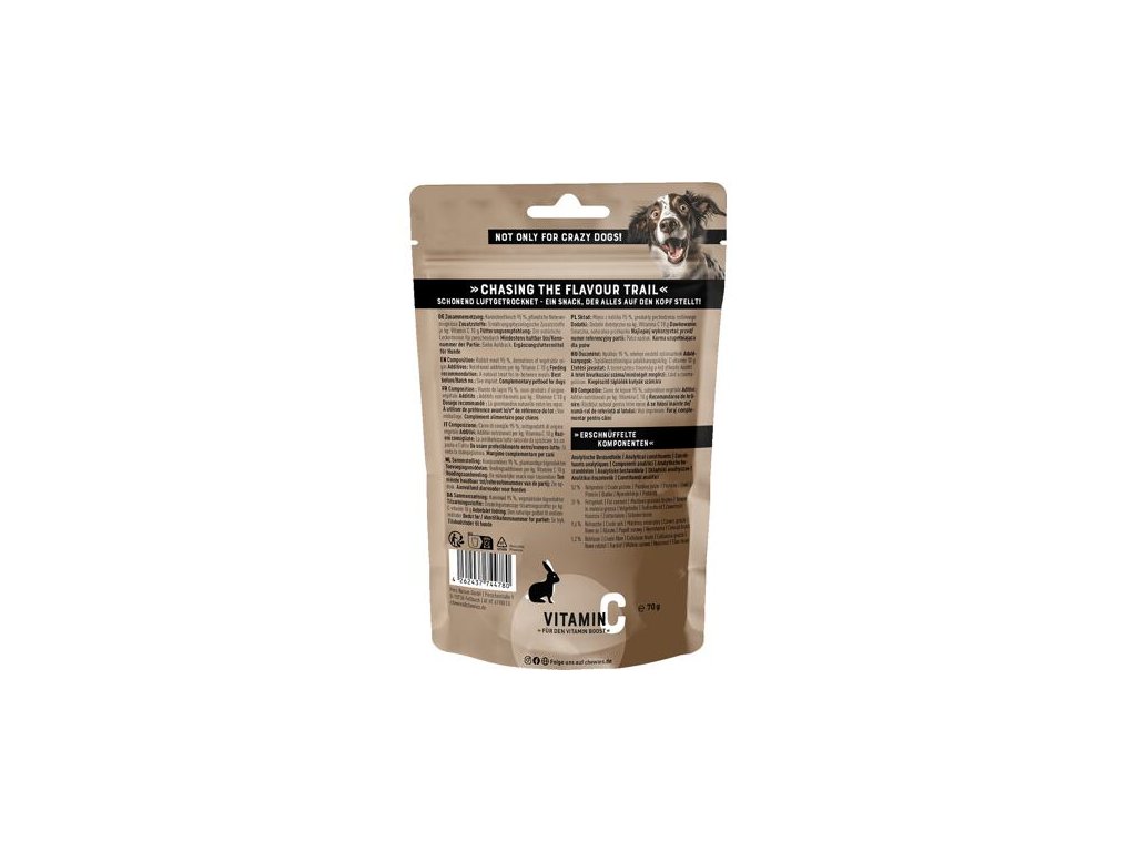 Plátky vzduchem sušeného masa s extra dávkou vitamínu C jsou přírodní pamlsky pro psy každého věku a velikosti, od štěňat až po seniory.Obsahují 95 % králičího masa a díky monoproteinovému složení jsou vhodné i pro psy s potravinovými alergiemi. Nenajdete v nich obiloviny, přidaný cukr, umělá barviva, aromata ani konzervanty. Maso je šetrně sušené vzduchem, aby si zachovalo svou přirozenou chuť a živiny, a díky tomu je křehké a snadno se porcuje.
