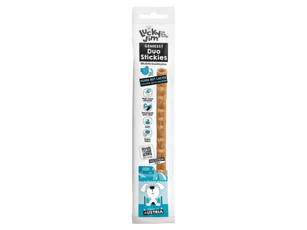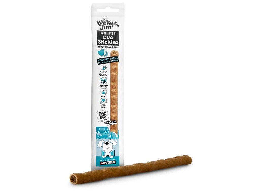 Lucky Jim DuoStickies jsou masové tyčinky se šťavnatou náplní a vysokým podílem masa. Skvěle poslouží jako rychlá odměna jen tak pro radost, na cestách i při návštěvách, kdy chcete pejskovi přinést drobnou pozornost. Díky měkké konzistenci je lze snadno nalámat na menší kousky a využít také při tréninku.Tyčinky neobsahují obiloviny ani přidaný cukr. Receptura s kuřecím masem a lososem je navíc doplněna o špenát, pivovarské kvasnice a řasu spirulinu, které podporují celkovou kondici, trávení i vitalitu psa.