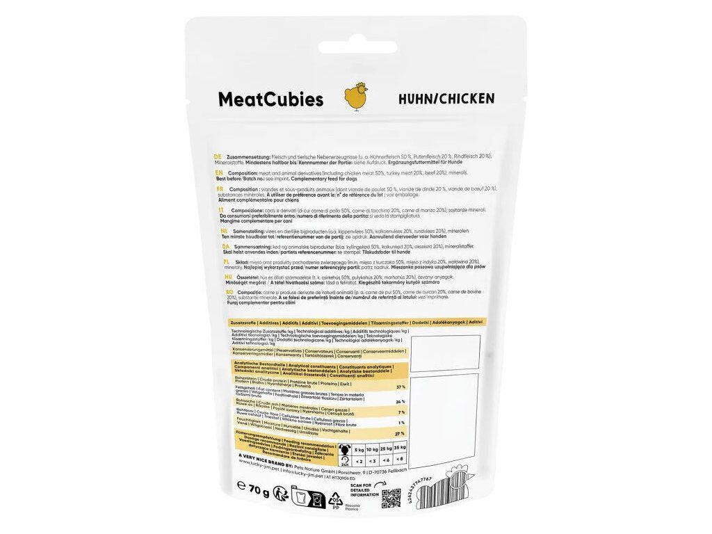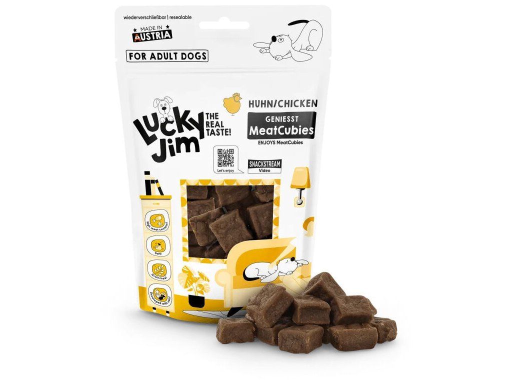 Lucky Jim MeatCubies jsou měkké a šťavnaté pamlsky ve formě masových kostek. Vysoký obsah kuřecího, krůtího a hovězího masa jim dodává intenzivní vůni a plnou chuť, díky které chutnají i vybíravějším psům. Jednoduché složení bez obilovin a přidaného cukru podporuje dobrou stravitelnost a umožňuje jejich každodenní podávání Díky uzavíratelnému obalu vydrží pamlsky měkké a chutné i po otevření, a můžete je vzít všude s sebou.měkké, šťavnaté masové kostky