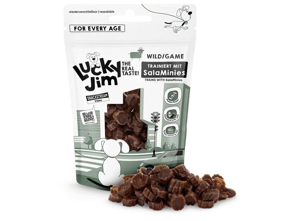 Lucky Jim SalaMinies jsou měkké pamlsky ve formě malých salámkových koleček, které mají praktickou velikost pro rychlé odměňování nejen při tréninku. Vysoký podíl živočišné složky (94 %) a jednoduché složení z nich dělají chutnou volbu i pro vybíravější psy.Receptura neobsahuje obiloviny ani přidaný cukr a měkká konzistence umožňuje snadné podávání kdykoliv a kdekoliv. Uzavíratelný obal navíc pomáhá udržet pamlsky měkké a chutné i po otevření, takže je můžete bez obav vzít s sebou na cesty.