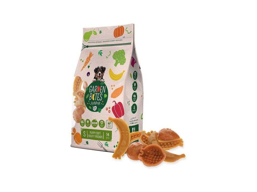 Vegetariánské pamlsky Garden Bites Junior jsou ideální odměnou pro vaše štěně, obzvláště v období přezubování. Obsahují velkorysý podíl batátové mouky (přes 45 %) bohaté na vitamíny, vápník a železo. Speciální tvar a měkčí struktura pamlsků pomáhají masírovat dásně a čistit zuby štěněte. 100% bezlepkové pamlsky jsou snadno stravitelné a neobsahují cukr. A navíc jsou chuťově naprosto neodolatelné!