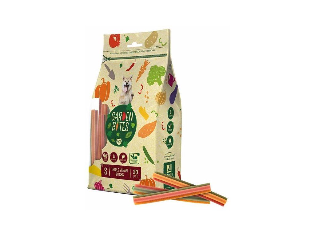 Vegetariánské pamlsky Garden Bites jsou ideální odměnou pro vašeho psa. Obsahují velkorysý podíl batátů (55 %) doplněný rajčaty, mrkví a okurkou. Batáty jsou bohaté na vitamíny, vápník a železo. Speciální tvar pamlsků pomáhá masírovat dásně a čistit zuby psa. Přírodní extrakt z máty navíc osvěžuje dech. 100% bezlepkové pamlsky jsou snadno stravitelné a díky tomu vhodné i pro psy s alergiemi. A navíc jsou chuťově naprosto neodolatelné!