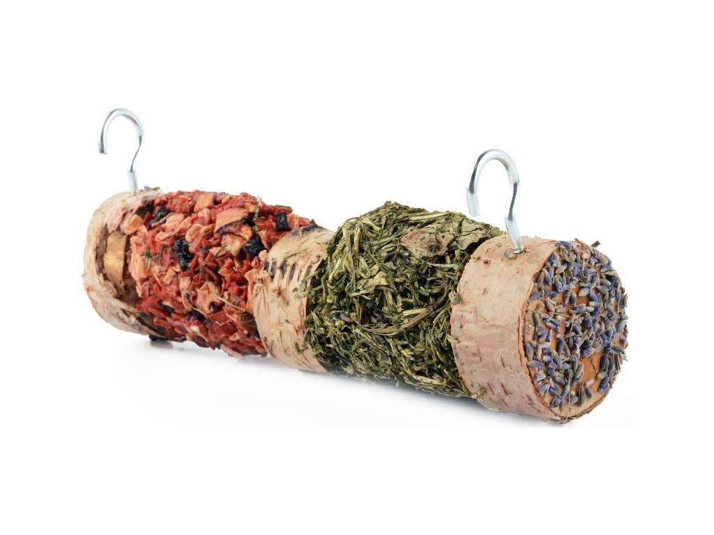 Směs chutné zeleniny a bylinek ve větvi z břízy podnítí vaše zvíře k aktivitě. Toto přírodní krmítko je vhodné zejména pro králíky, morčata, činčily, osmáky, ale také křečky, potkany, myši a další hlodavce.