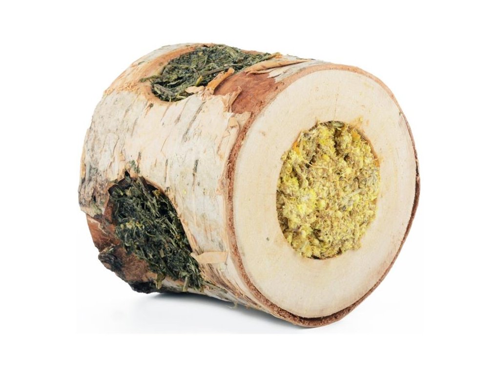 Kombinace pamlsku, hračky a materiálu k broušení hlodavých zubů. Dolování chutné směsi zvíře zabaví a pochutná si. Zbylý špalek z čerstvé břízy i s kůrou poslouží jako vítaný materiál k okusu. Malí hlodavci mohou tunel využít i jako úkryt.