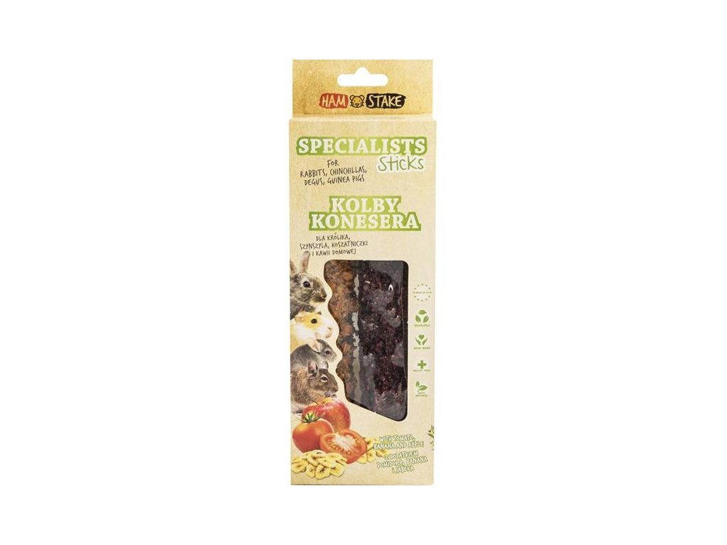 Neodolatelně voňavý klas Ham-Stake tvořený bohatou směsí sušených bylinek, sušené zeleniny a ovoce je opatřený konopným poutkem k zavěšení. Jde o skvělou interaktivní hračku a současně i velmi chutný a zdravý pamlsek pro všechny drobné hlodavé býložravce. Vašim malým kamarádům zajistí jedinečný chuťový a čichový zážitek i smysluplnou zábavu a poslouží jim také k obrušování zubů. Obsahuje množství vitamínů, minerálů a dalších zdraví prospěšných látek. Vysoké množství vlákniny prospívá správnému trávení. Pamlsek navíc šetří životní prostředí – lze zkonzumovat úplně celý včetně poutka, takže nevzniká žádný odpad.
