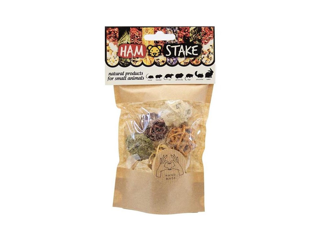 Malé křupavé grain free ratanové kuličky Ham-Stake se šesti různými příchutěmi jsou jedinečným mixem neodolatelných vůní, chutí i barev a opravdovým gurmánským požitkem pro vaše hlodavce. Každá ze šesti kuliček je obalená jinou sušenou zeleninou nebo bylinkou: od rajčete přes červenou řepu, pastinák, petržel, brokolici až po měsíček. A co víc: kuličky jsou nejen zdravým a chutným pamlskem, ale zároveň i zábavnou interaktivní hračkou, se kterou se váš malý kamarád nebude nikdy nudit. Voňavá a lahodná pochoutka ho podněcuje k aktivitě, stimuluje jeho přirozený hlodací instinkt a tím podporuje zdraví zubů. Obsahuje řadu vitamínů, minerálů a dalších zdraví prospěšných látek. Vysoké množství vlákniny podporuje správné trávení.