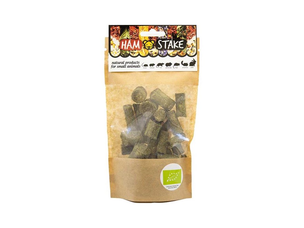 Grain free pamlsky Ham-Stake s kousky topinamburových stonků obalených voňavou sušenou petrželkou jsou ideální chutnou, křupavou a zdravou svačinkou pro králíky, morčata, osmáky, činčily, křečky, potkany, myši a pískomily. Topinamburové stonky a petrželová nať jsou vhodným zdrojem vlákniny a obsahují množství přirozeně se vyskytujících vitamínů, minerálů a dalších zdraví prospěšných látek. Topinambur upravuje zažívání, petrželka čistí organizmus, je močopudná, tlumí záněty a posiluje imunitu (vitamín C).