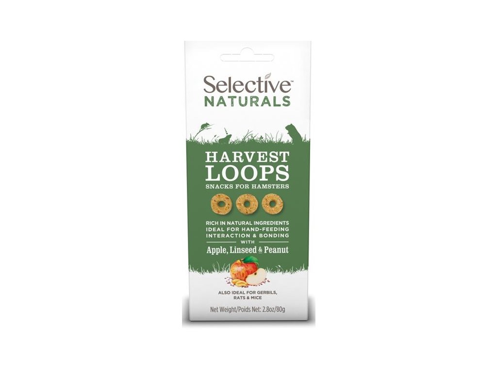 Zdravé přírodní pamlsky Selective Naturals ve tvaru kroužků pro křečky, potkany a další všežravé drobné savce. Ideální pro podávání z ruky, které sbližuje a pomáhá vytváření bližšího vztahu se zvířetem.