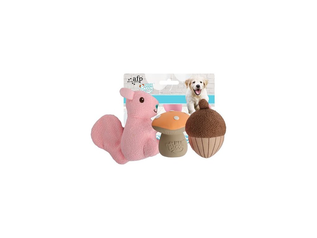Hračky z řady Little Buddy jsou tu pro všechny malé pejsky a štěňátka, kteří chtějí objevovat a užívat si nové zábavné prvky ke hře!Detailně propracované hračky jsou vyrobeny z různorodých textur a materiálů – veverka a oříšek jsou vyrobeny z měkkého plyše s vyšívanými prvky a houbička je z latexu. Všechny hračky obsahují pískátko a veverka má šustící ocásek.