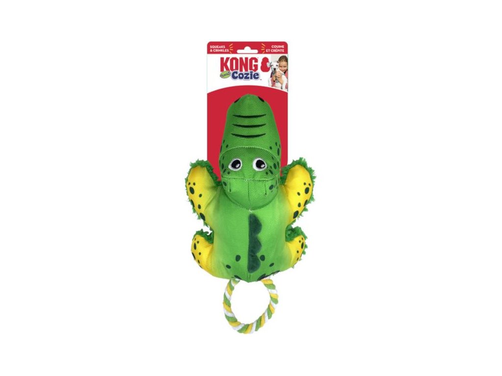 Hračka pro psy KONG Cozie Tuggz Gator je roztomilý barevný aligátor s provazovou rukojetí – smyčkou ze silného bavlněného lana, jehož konce vytvářejí uzel vnořený do aligátořího těla. Po skousnutí vydává hračka pískavé zvuky. Břicho a vnitřní stranu končetin pokrývá hebký a měkký plyš, zatímco ostatní části jsou vyrobeny z látky. Hračka dokonale uspokojují přirozené psí instinkty a zabaví na dlouhé hodiny. Konstrukčně je uzpůsobena k přetahování, díky vyztužené plyši a silné a pevné látce odolá i zuřivému třepání a lomcování, náruživému okusování i obyčejnému mazlení. Pískání upoutá zájem vašeho psa a povzbudí ho k další hře. Hračku lze snadno přenášet v tlamě a její měkké tělo je příjemné na okusování a šetrné k zubům i dásním. Velikost M/L je vhodná pro psy středních a velkých plemen.