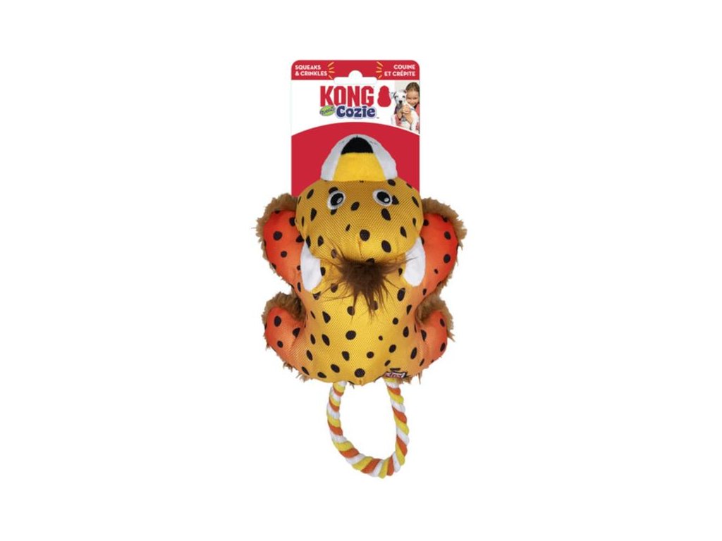 Hračka pro psy KONG Cozie Tuggz Cheetah je roztomilý barevný gepard s provazovou rukojetí – smyčkou ze silného bavlněného lana, jehož konce vytvářejí uzel vnořený do gepardího těla. Po skousnutí vydává hračka pískavé zvuky. Břicho a vnitřní stranu končetin pokrývá hebký a měkký plyš, zatímco ostatní části jsou vyrobeny z látky. Hračka dokonale uspokojují přirozené psí instinkty a zabaví na dlouhé hodiny. Konstrukčně je uzpůsobena k přetahování, díky vyztužené plyši a silné a pevné látce odolá i zuřivému třepání a lomcování, náruživému okusování i obyčejnému mazlení. Pískání upoutá zájem vašeho psa a povzbudí ho k další hře. Hračku lze snadno přenášet v tlamě a její měkké tělo je příjemné na okusování a šetrné k zubům i dásním. Velikost S/M je vhodná pro štěňata a psy menších a středních plemen.