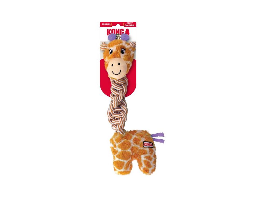 Roztomilá barevná hračka pro psy KONG Knots Twists je plameňák/žirafa vyrobené z různorodých materiálů, který podněcuje přirozené psí instinkty a tříbí jejich smysly. Dlouhý pohyblivý provazový krk, kolem něhož se ve spirále ozdobně obtáčí silné bavlněné lanko, láká k okusování, třepání a drancování. Díky měkké, ale přitom pevné přízi, ze které je lano spleteno, je tato hračka šetrná k zubům i dásním, ale zároveň velice odolná vůči zničení. Navíc žvýkáním lana si vaši psi čistí zuby. Ostatní části těla plameňáka/žirafy jsou plyšové, hebké a jemné na dotek i skus, a vycpané malým množstvím výplně – v případě protržení se nemusíte bát velkého nepořádku. Hračka navíc vydává pískavé zvuky, které stupňují zvědavost a vzrušení a nabádají k další hře. Má mnohostranné využití a lze ji snadno přenášet v tlamě. Svými rozměry (velikost M/L) vyhovuje psům středních a větších plemen.