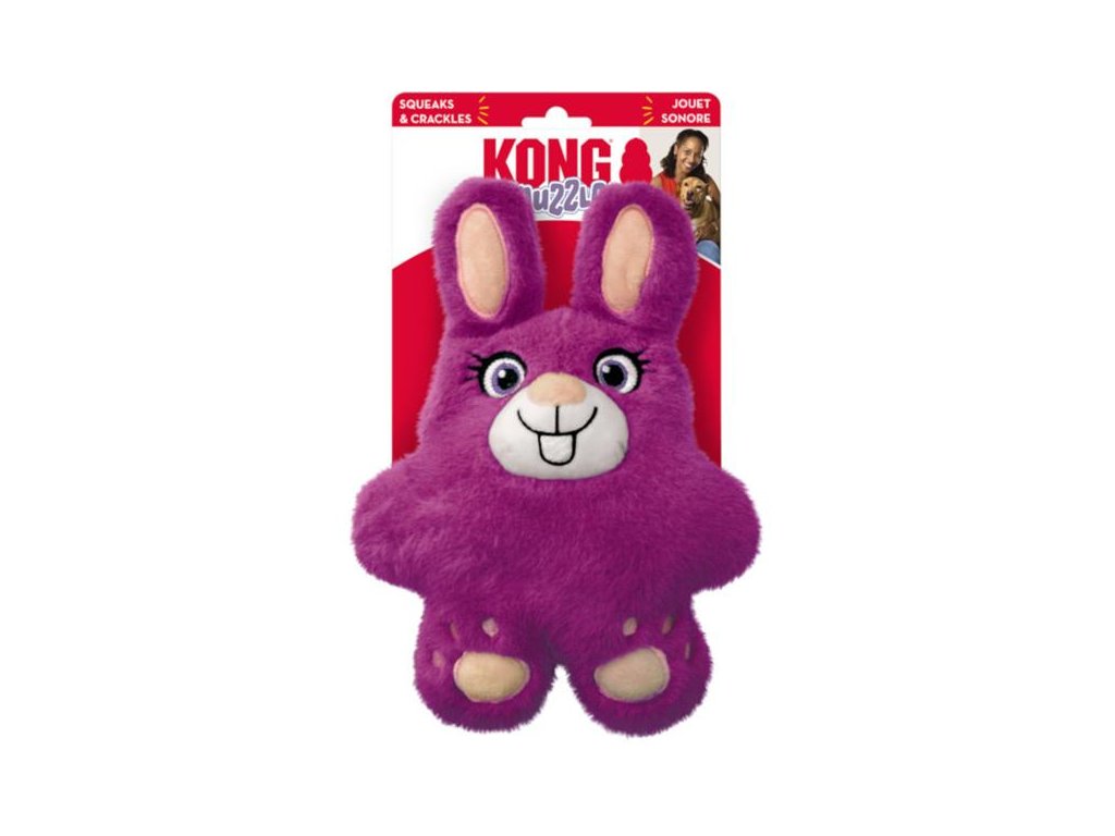 KONG Snuzzles Bunny pro psy připomíná malého baculatého králíka zploštělého do tvaru polštáře s výrazně vyčnívajícím sametovým čumákem a zvlněnými okraji tvořenými králičíma ušima a jeho roztaženými končetinami. Hračka je vyrobena z mimořádně hebkého a jemného plyše, který je velmi příjemný na dotek i žvýkání. Vašim psům poskytne spoustu zábavy, protože při každém jejím skousnutí se ozve dlouhé a hlasité pískání a uši králíka jsou vyplněny šustivým materiálem. Hračku lze použít nejlépe v interiéru. Není příliš veliká a díky svému plochému tvaru, vystouplému čumáku a zvlněným okrajům ji lze snadno přenášet v tlamě. Je vhodná pro psy všech velikostí.