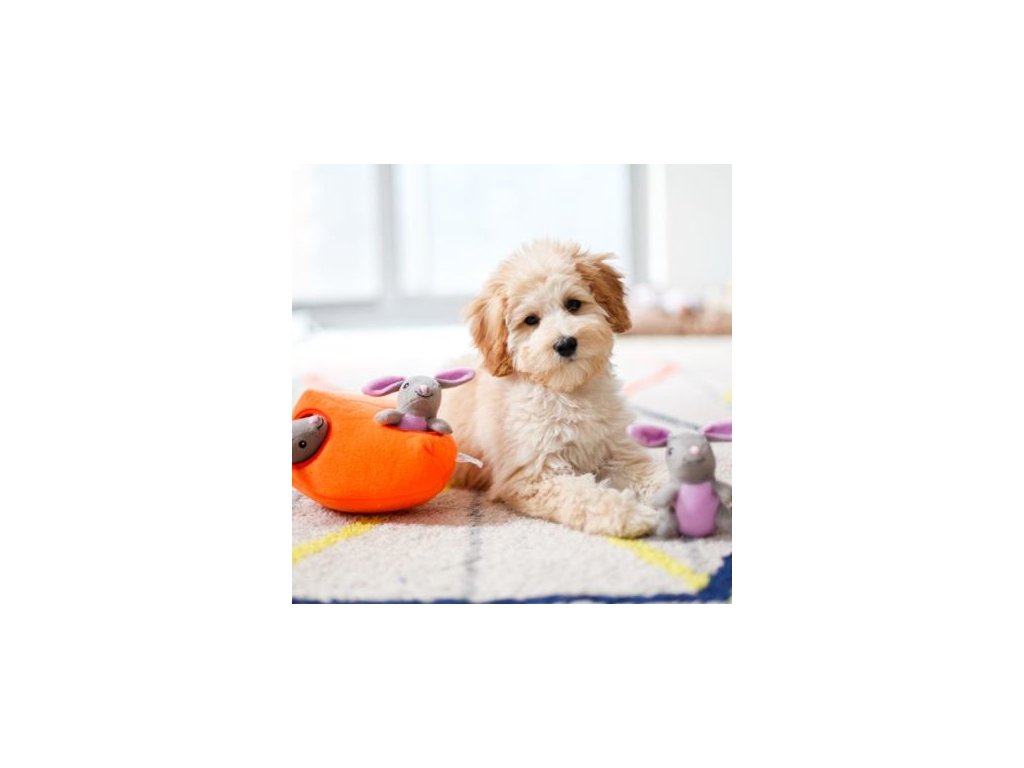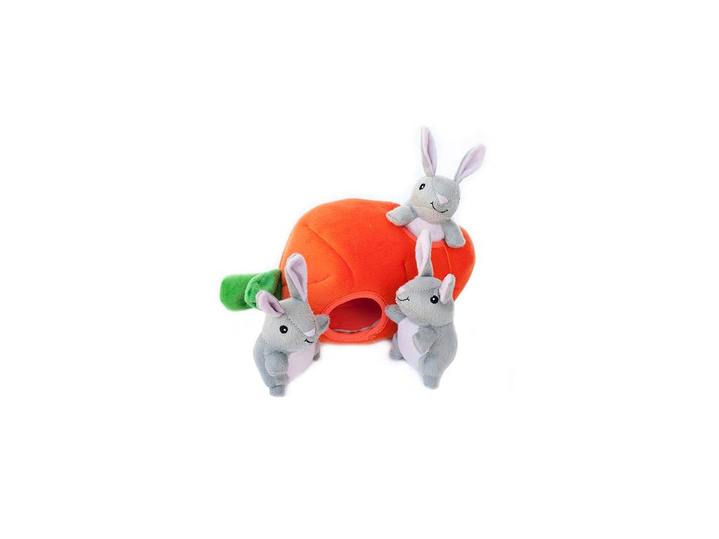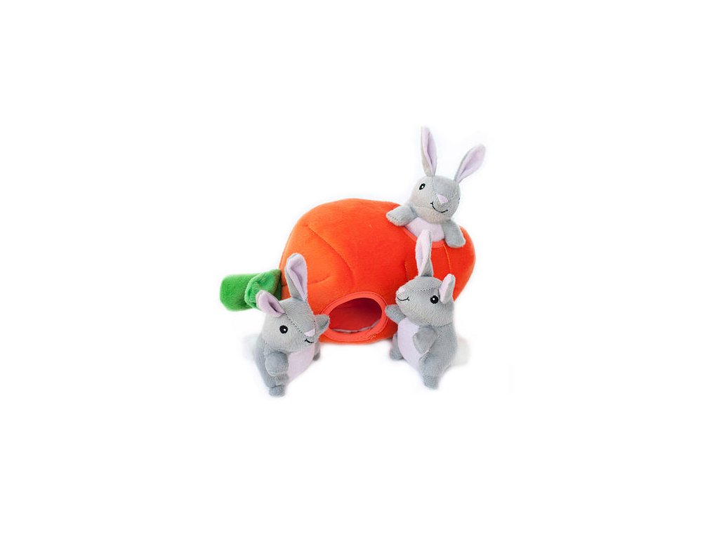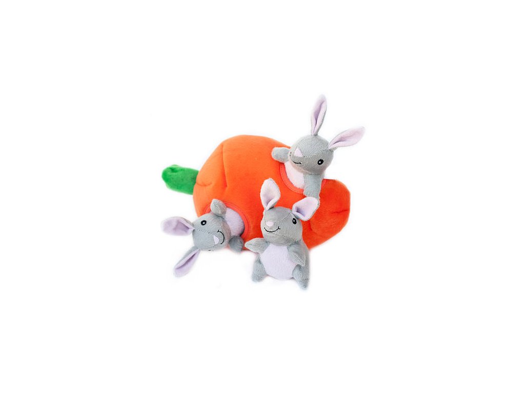 Interaktivní plyšová hračka. Tři malí králíci ve svém hnízdě z mrkve.Psi milují vyndávání malých plyšových zvířátek z jejich schovávačky. Tato hračka zaměstná Vašeho mazlíčka na dlouhou dobu.