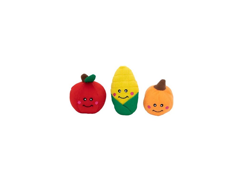 Jablko, kukuřice a dýně představují plyšové trio hraček, které jsou ideální zejména pro malé pejsky nebo pro schovávání do interaktivních ZippyPaws Burrow.Každá z nich má v sobě kulaté pískátko, ideální pro malé psí tlamičky.