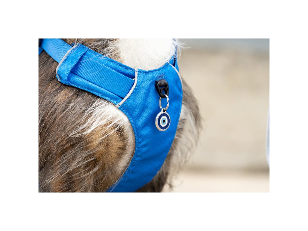 Postroj je vybaven dvěma úchyty – kroužek z nerezové oceli na hřbetu postroje slouží k připnutí vodítka, zatímco menší úchyt z pevného plastu na hrudní části je ideální na identifikační známku nebo světýlko.
