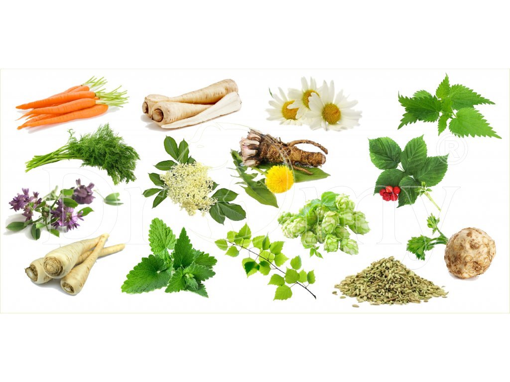 celer bulvový, tolice vojtěška, bříza list, heřmánek květ, pampeliška list, bez černý plod,