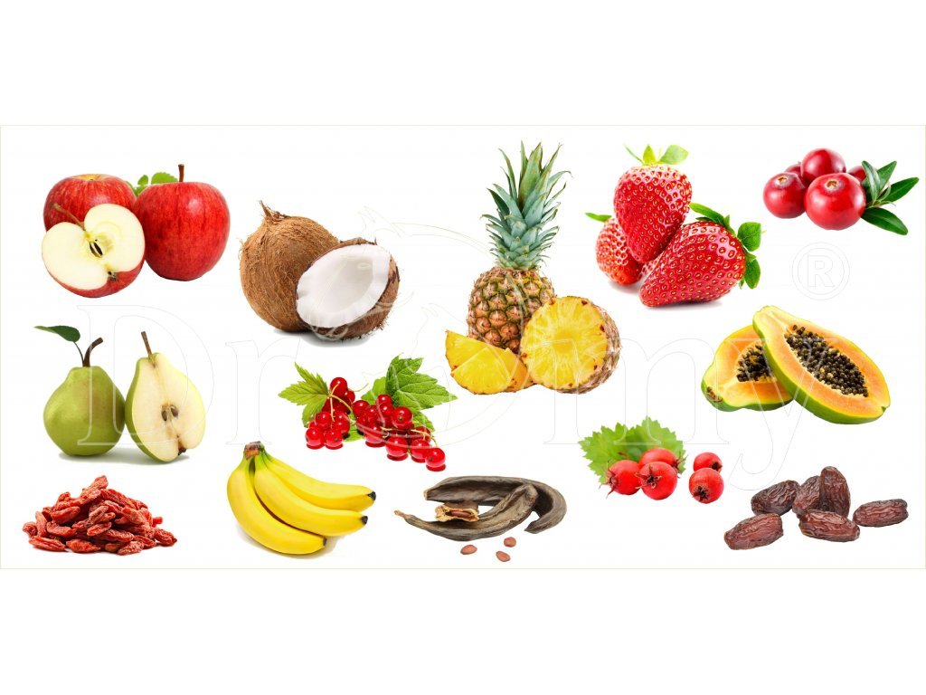 goji, moruše, ananas, hloh, rybíz, papaya, liofilizované jahody - mrazem sušené.