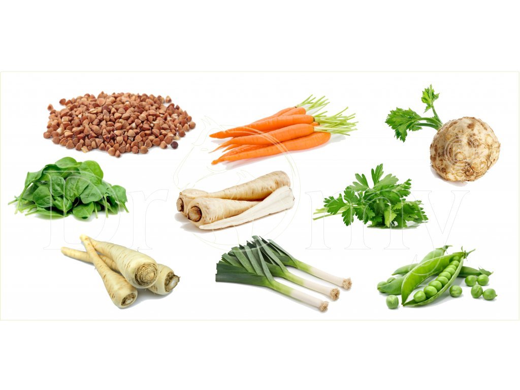pohankové vločky, mrkev, pastinák, celer, pór, hrachové vločky, petržel, špenát.