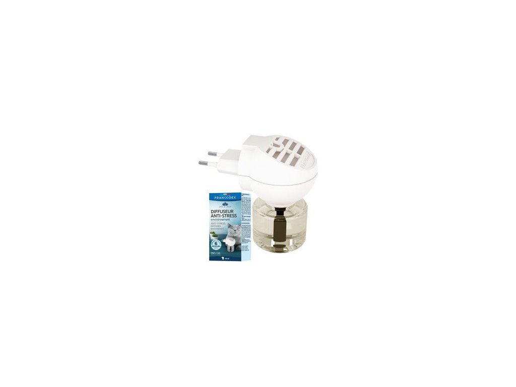Kočky přirozeně vytvářejí uklidňující feromony, které jim umožňují zklidnění v různých situacích. Francodex Anti-stress difuzér obsahuje syntetickou verzi těchto feromonů, které pomáhají vytvářet prostředí, ve kterém se kočka cítí bezpečně. Doporučujeme použít zvláště v případě nevhodného chování kočky (močové značení, nadměrné škrabání) způsobené stresovými situacemi jako je stěhování, změna prostředí, příchod dalšího zvířete do domácnosti, narození dítěte, vystavení nadměrnému hluku nebo při společenských akcích.Obsah lahvičky vystačí na 6 týdnů.