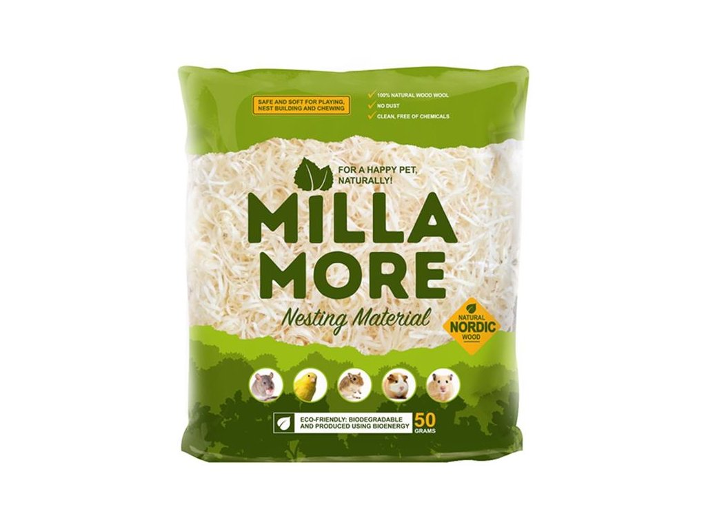 MILLAMORE materiál na hnízda je dřevitá vlna vyrobená z osikového dřeva. Je to měkký a bezprašný materiál, perfektní pro stavbu úkrytů a hnízd drobných savců a ptáků a udržení tělesné teploty při odpočinku a spánku. Obohacuje životní prostor v kleci, omezuje stres a podporuje welfare zvířat.