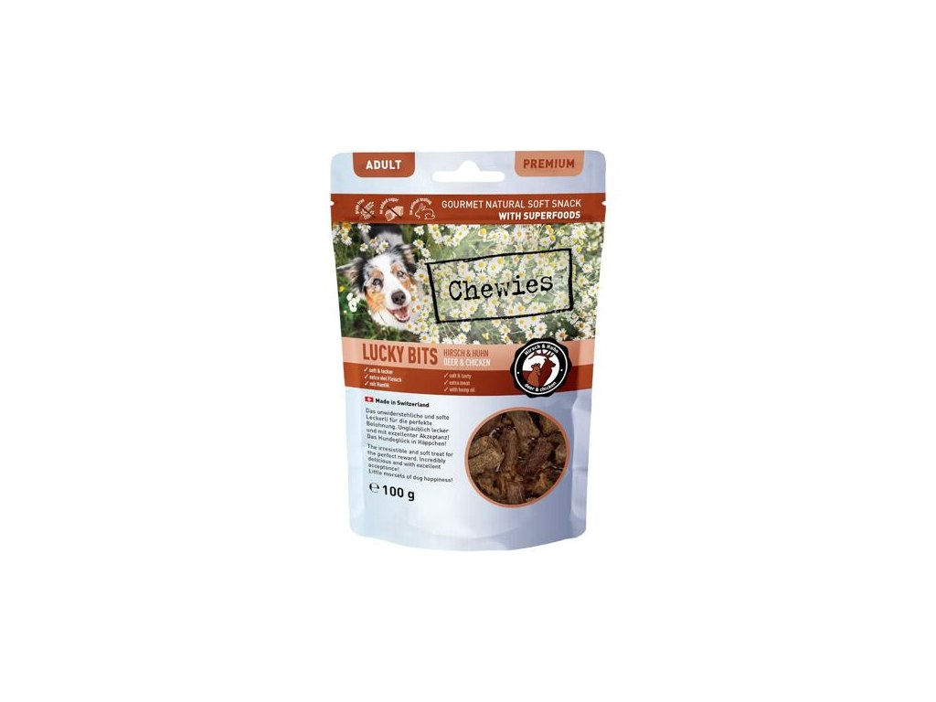 Chewies Lucky Bits jsou pamlsky s extra vysokým obsahem masa, které poslouží jako skvělá odměna a zdravá svačinka nejen při tréninku.Neobsahují obiloviny ani přidaný cukr a jsou vyráběny za těch nejpřísnějších podmínek ve Švýcarsku.