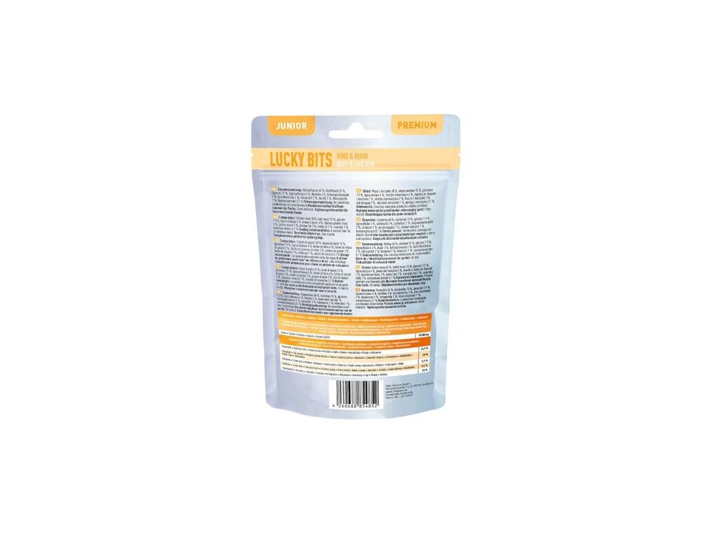 Chewies Lucky Bits jsou pamlsky s extra vysokým obsahem masa, které poslouží jako skvělá odměna a zdravá svačinka nejen při tréninku.Díky konopnému oleji a pivovarským kvasnicím poskytují psům obzvlášť vysoké množství živin, což ocení zejména psí junioři.