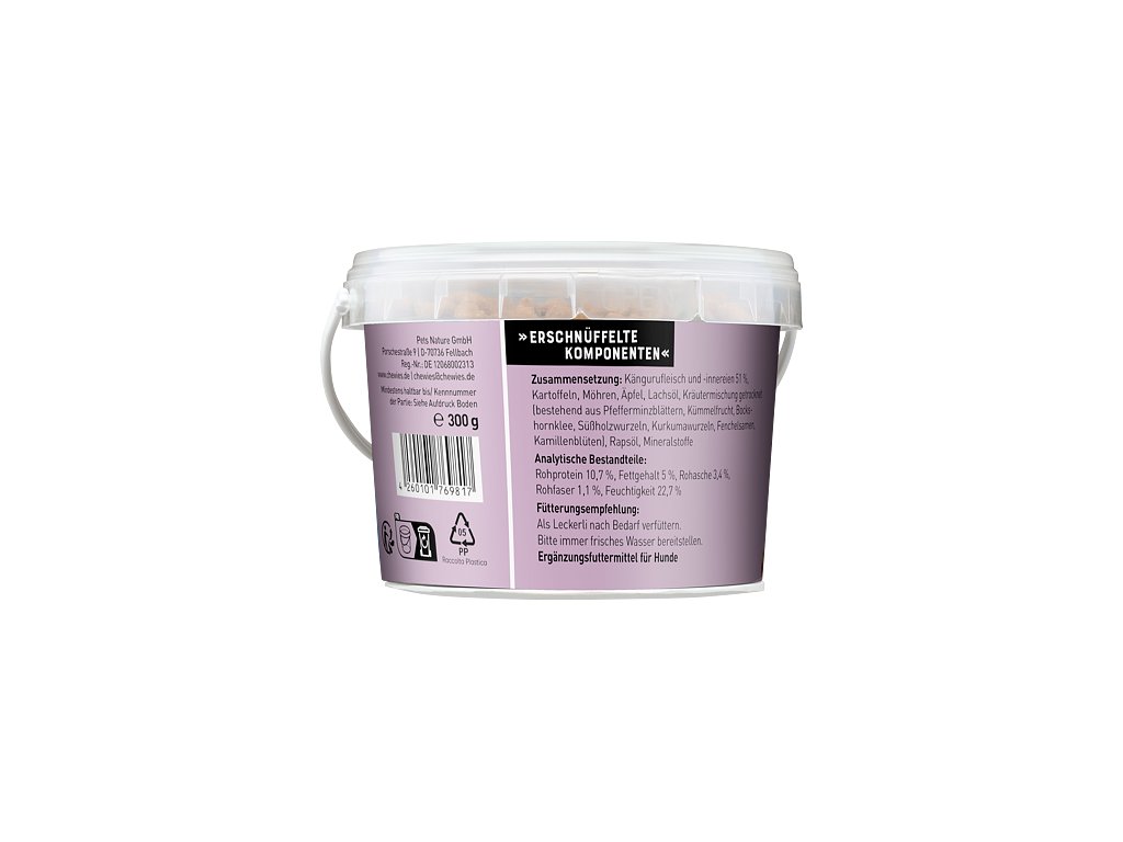 Poloměkké pamlsky s klokaním masem jsou 100% přírodní a kromě klokaního masa obsahují brambory, jablko, mrkev, lososový olej a bohatou směs bylinek, která jim dodává neodolatelnou vůni.Nenajdete v nich žádná umělá dochucovadla, obiloviny ani cukr, jsou snadno stravitelné a vhodné i pro psy s citlivým zažíváním.