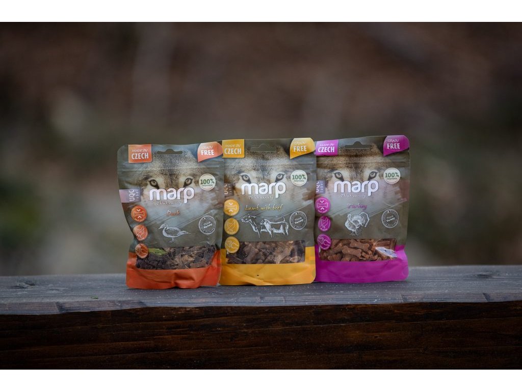 Marp think variety je nejnovější řada, ve které jsme se vrátili k tradičním recepturám v duchu maso a rýže, ale posunuli jsme je dál dle možností dnešních technologií. Tato řada je kompletně bez lepku, protože víme, že na lepek mohou být alergičtí i psi. Stejně tak v této řadě nenajdete nic z kuřete - všechny receptury jsou bez kuřecího masa, tuku nebo vnitřností. Kombinace čerstvého a sušeného masa zajišťuje jak dostatek živočišných bílkovin, tak také vysokou chutnost. Jednoduché receptury bez jakýchkoliv umělých konzervantů nebo barviv zajišťují, že krmivo bude pro vašeho psa skutečně funkční a bude po něm výborně prospívat.