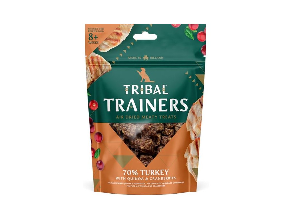Výcvikové pamlsky Tribal Trainers Turkey & Cranberry jsou připravené z čerstvého krůtího masa a superpotravin, jako jsou brusinky, které pomáhají podpořit imunitní systém. Šetrný výrobní proces – sušení na vzduchu za nižších teplot – zajišťuje, že jsou pamlsky měkké, šťavnaté a plné živin.