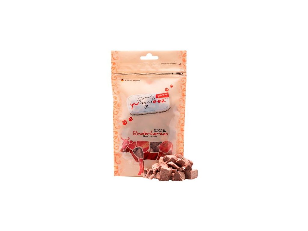 Yummeez Pure jsou čistě přírodní kousky mrazem sušeného masa pro psy s velmi intenzivní chutí. Proto jsou skvělým způsobem jak motivovat psa při výcviku.Obsahují 100 % masa z hovězích srdcí a jsou vynikající odměnou i pro vybíravé a na výživu citlivé pejsky.