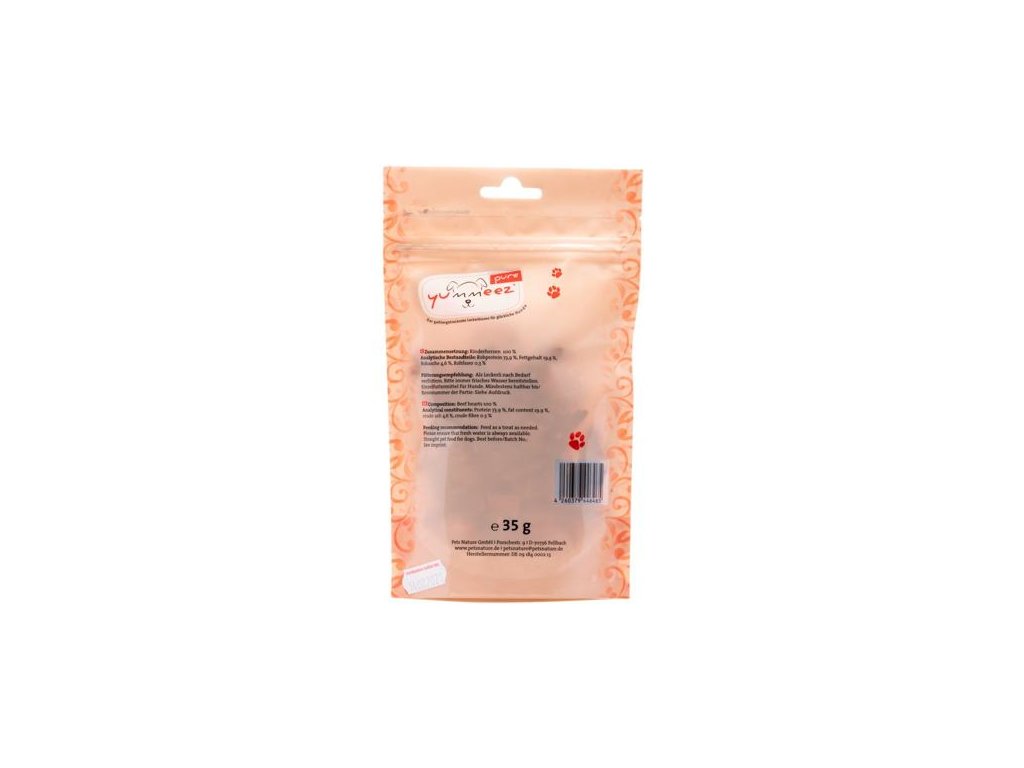 Pamlsky pro psy Yummeez Pure obsahují 100 % hovězích srdíček – bez jakýchkoliv dalších příměsí. Proto jsou zvláště vhodné pro psy s potravinovými alergiemi a speciálními výživovými potřebami. Tyto čistě přírodní pamlsky milují i vybíraví čtyřnožci, protože díky speciálním výrobním postupům jsou Yummeez Pure obzvláště chutné!