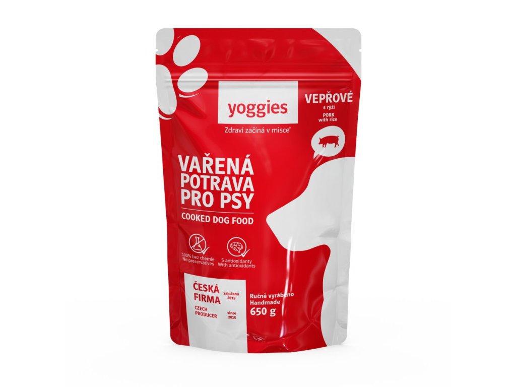 Yoggies Vařená potrava pro psy – vepřové maso s rýží, 650g