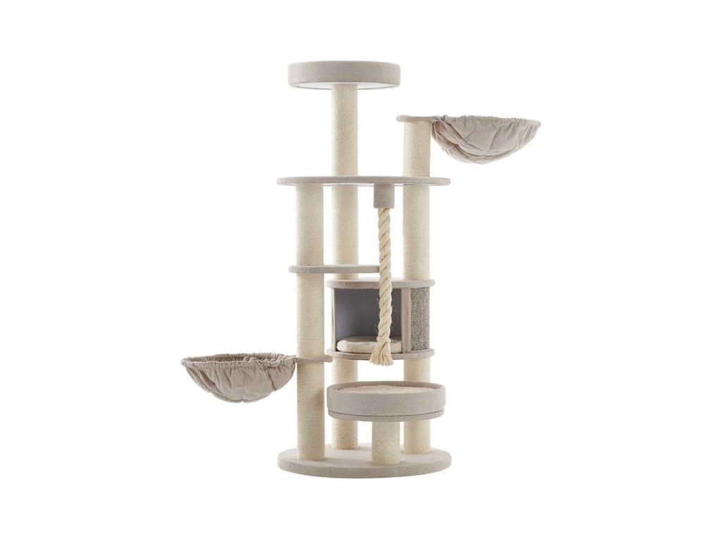 Vícepatrové stromové škrabadlo Fida pro kočky v krémové barvě a sisalovým kmenem. Plošiny a budka jsou kompletně potaženy látkou.