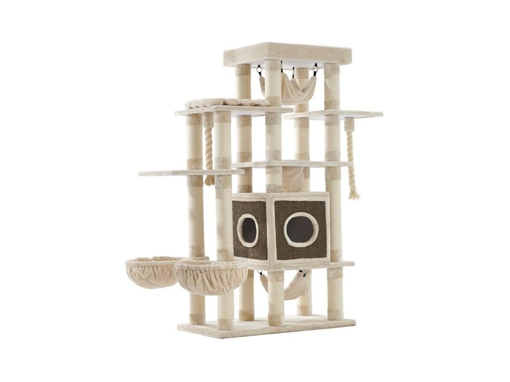 Vícepatrové stromové škrabadlo Gadi pro kočky v krémové barvě a sisalovým kmenem. Plošiny a budka jsou kompletně potaženy látkou.