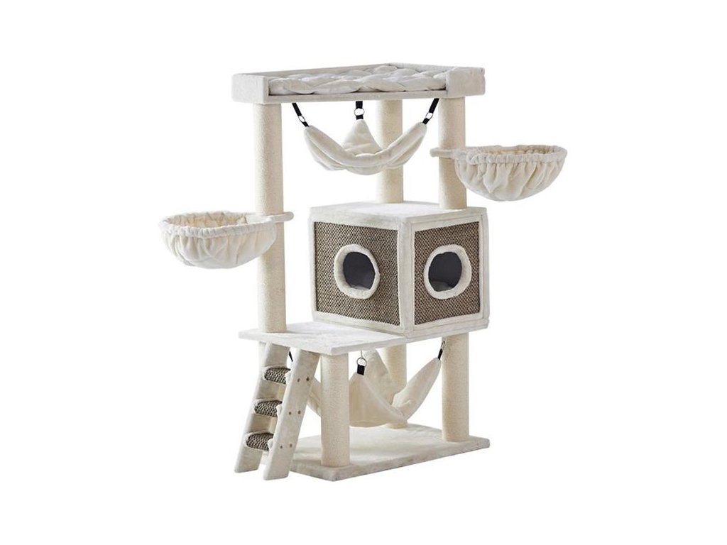 Houpací síť, žebřík a sisalové kmeny zajišťují hravou rozmanitost a nezbytnou péči o kočičí drápky.