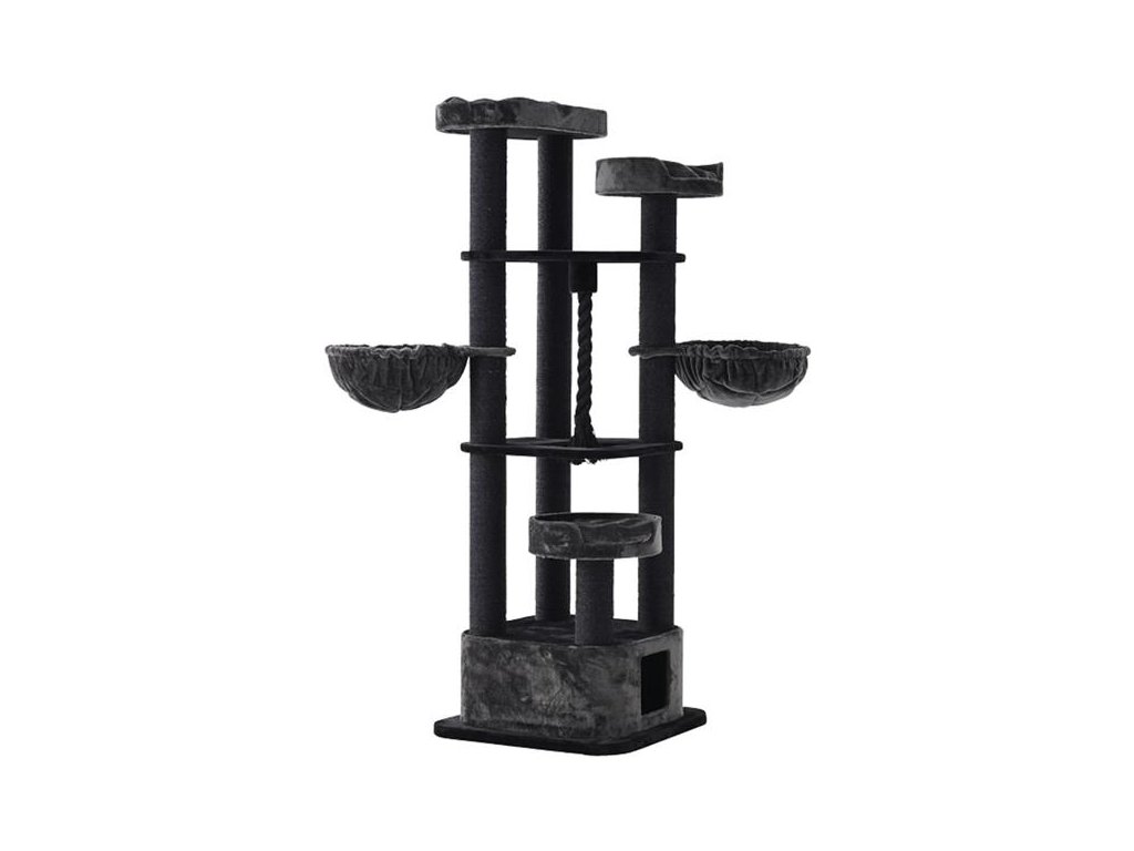 Vícepatrové stromové škrabadlo Musan pro kočky v černé barvě a sisalovým kmenem. Plošiny a budka jsou kompletně potaženy látkou.
