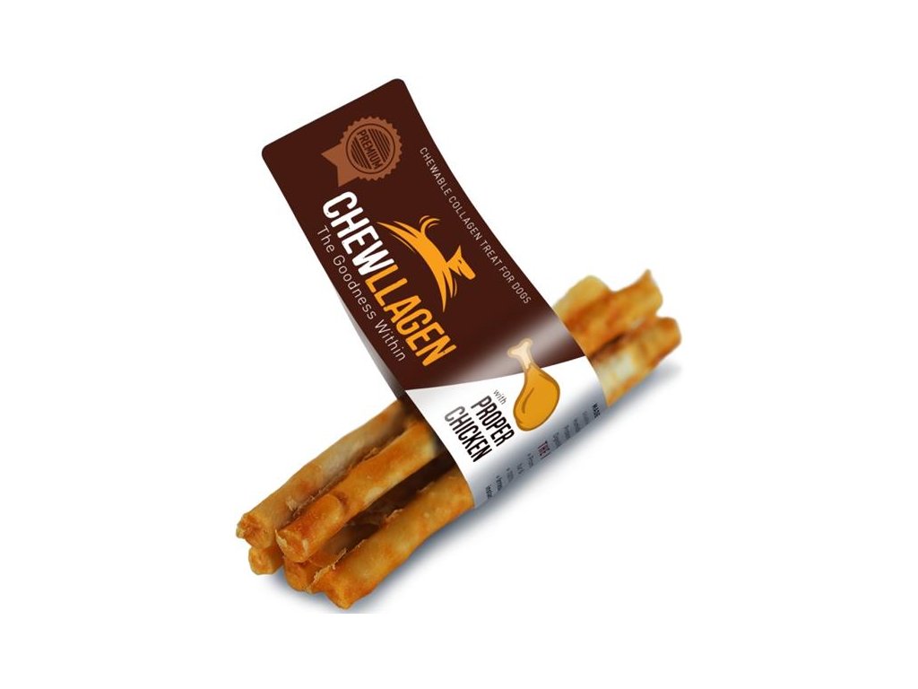 Pochoutky Chewllagen jsou ideální jako odměna, jíž psovi dodáte sílu a podpoříte jeho zotavení např. po delší procházce. Vyrábějí se z čistého kolagenu získávaného z kůže volně pasených jihoamerických krav. V procesu ohřevu jsou kolagenové bílkoviny hydrolyzovány a štěpí se na menší, snadněji stravitelné molekuly. Poté je kolagen vytvarován, upečen a nakonec dochucen skutečným hovězím nebo kuřecím.
